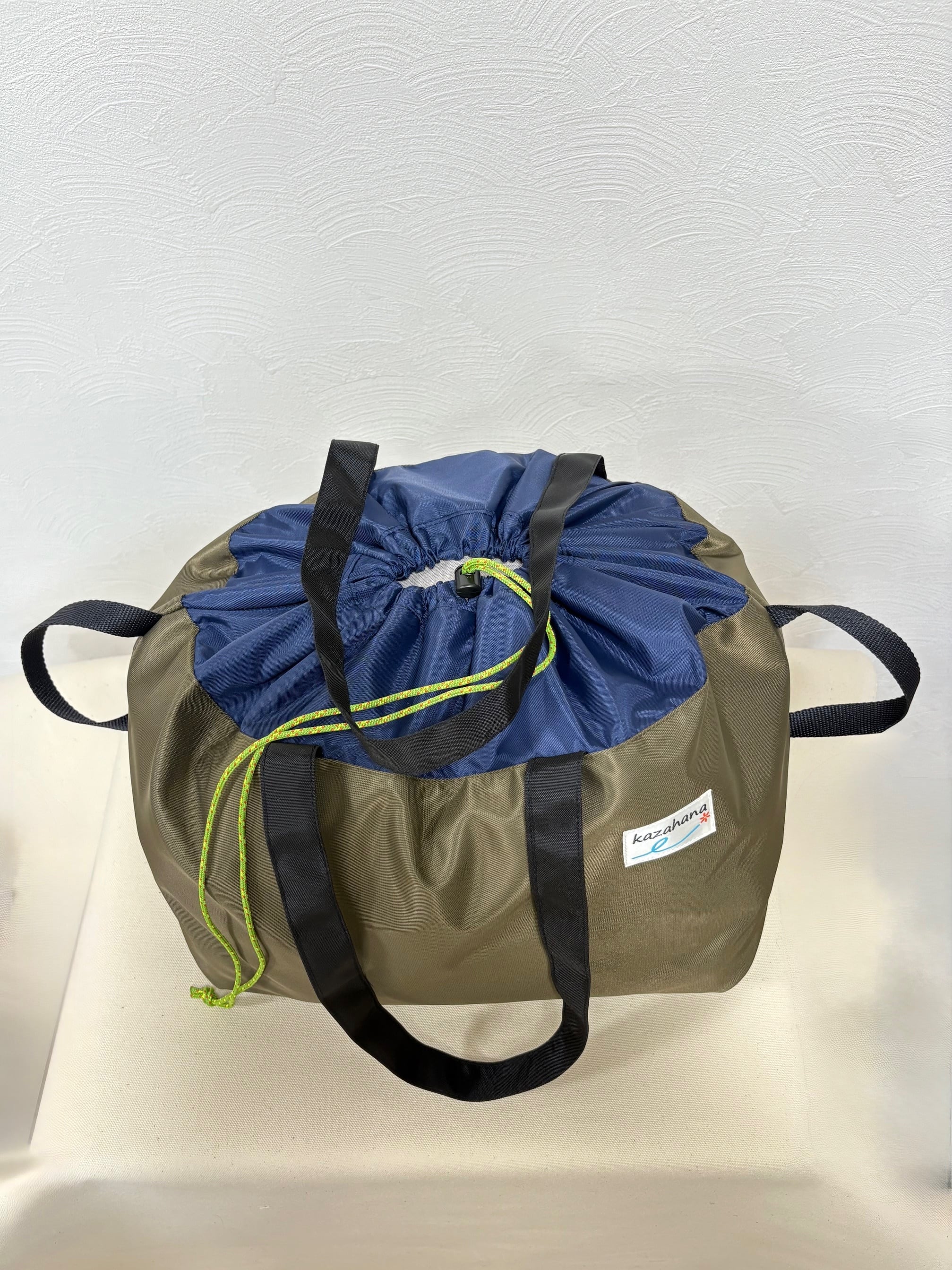 kazahanaスワローギアバッグは、画像:1 のように2セット以上のカムと20本以上のクイックドロー、その他のカラビナ、スリング類やヘルメット、クライミングシューズまでをも収納できる汎用性の高いギアバッグです(画像:1を収納後の状態 - 画像:6)。パッキング時の視認性を良くするために開口部を広くした横型デザインですが、両サイドにハンドルを備えて(画像:2)バックパックへの収納もストレス少なく行えます(画像:5)。メインハンドルも少し長めの設計なので、ギア類が収納されたスワローギアバッグも肩に掛けての持ち運びが容易です(画像:7)。