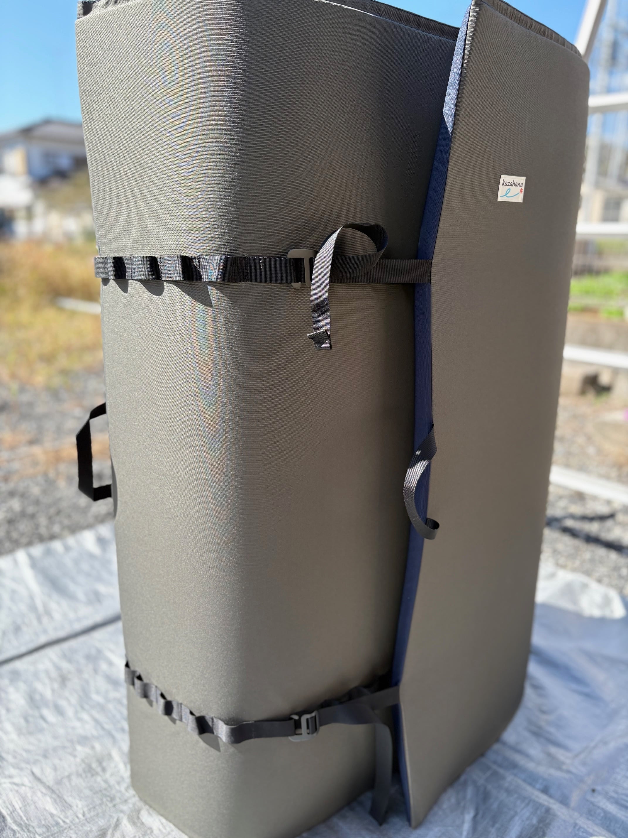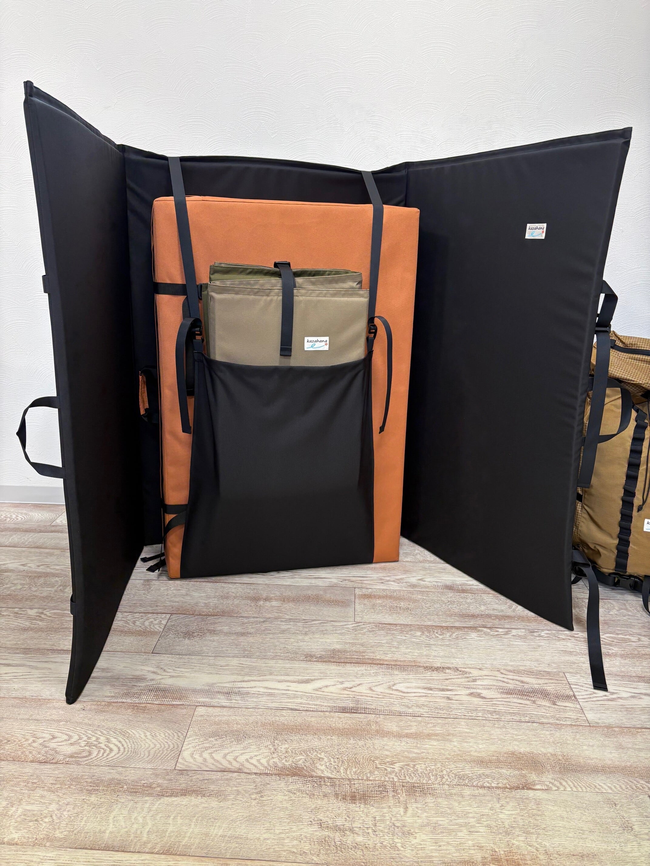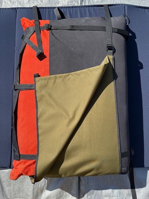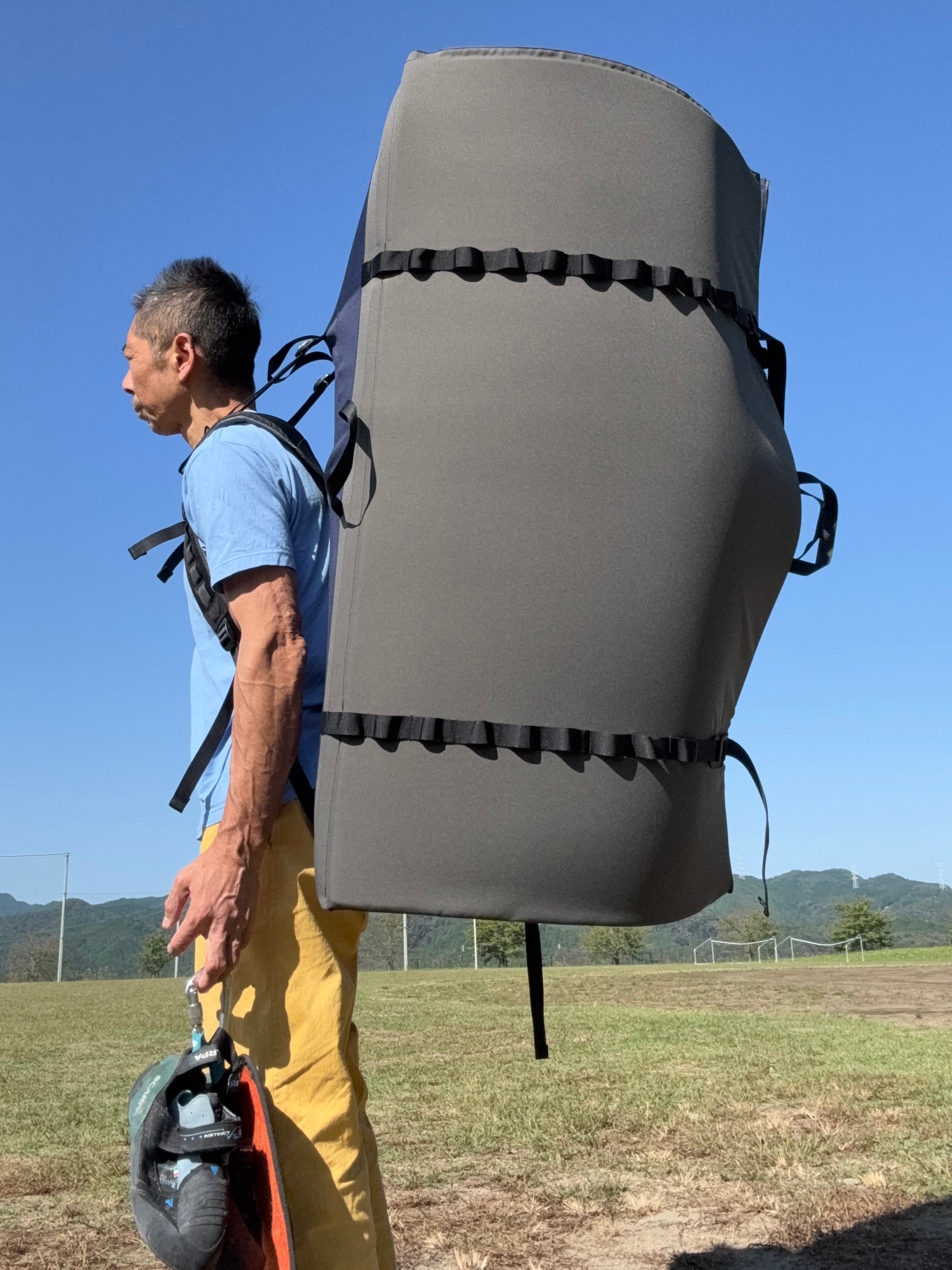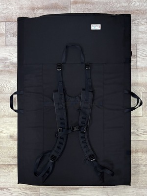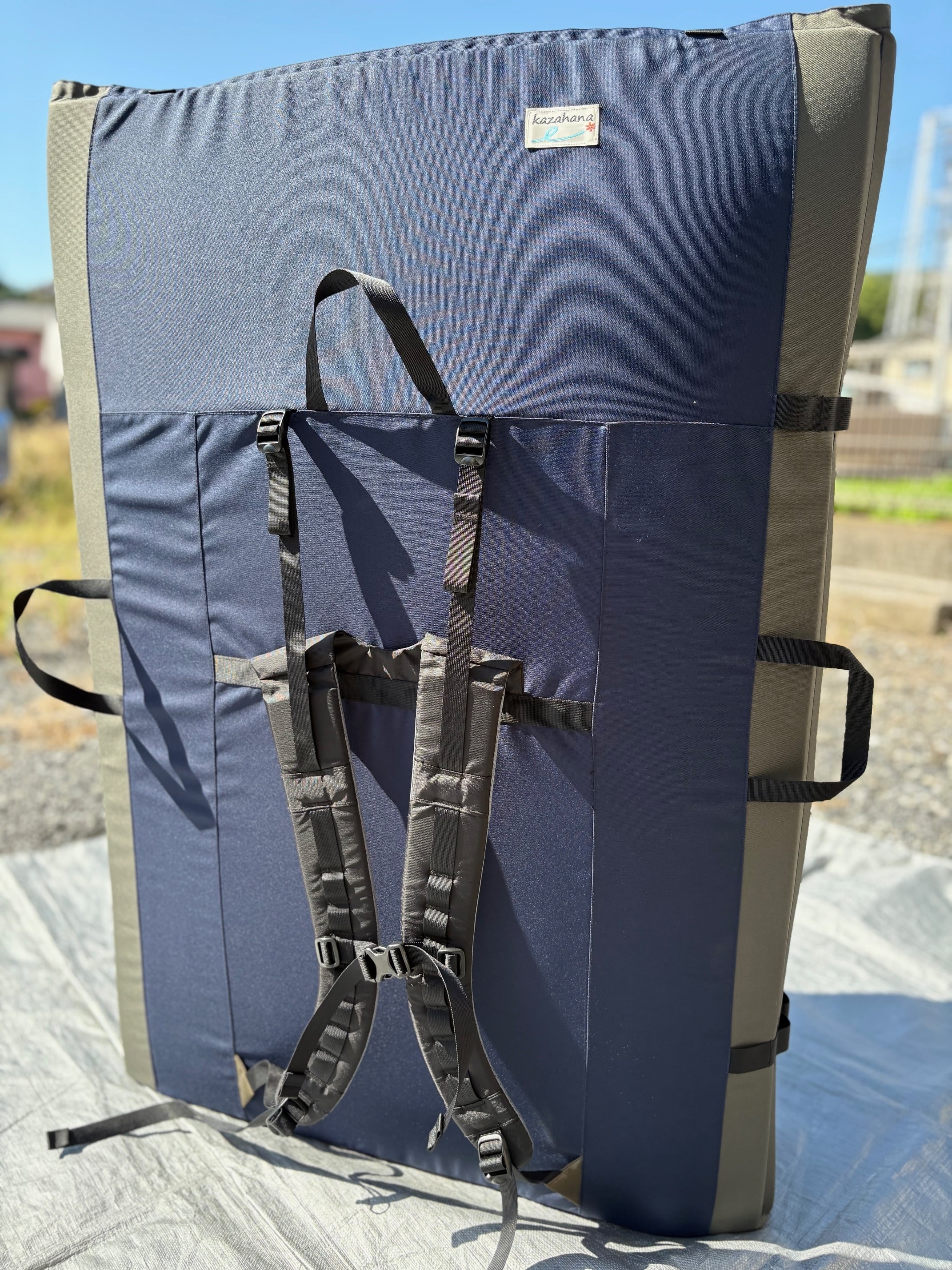 アウターラッピングスタイルのパッドキャリー kazahanaパッドマックスは最大2枚のメインパッド(※およそ 縦90cm×横60cm×厚さ20cm を2枚)をラッピングして背負い、そしてワイドカバーのパッドとして使用可能です。2cm厚ポリエチレンフォーム3面構造で、中央のフラップホルダー(画像 : 5)と2本のアウターコンプレッションベルトが収納品をしっかりとホールドします。このフラップホルダーは、パッドとして使用する際のショルダーハーネスカバーとしても機能します(画像 : 17、18)。そしてもちろん、背面部はkazahanaの完璧なバックパックショルダーハーネスを備えて(画像 : 16)メインパッドを内包しても軽快に歩行できます。
