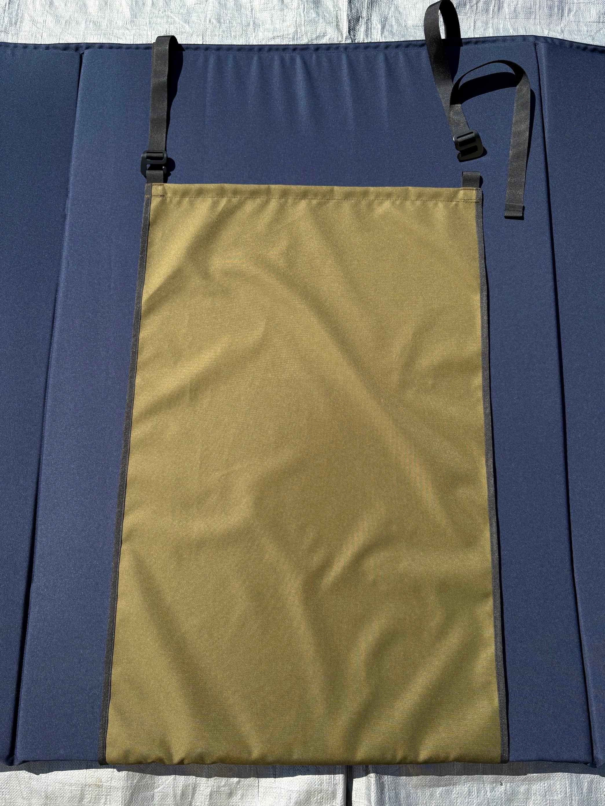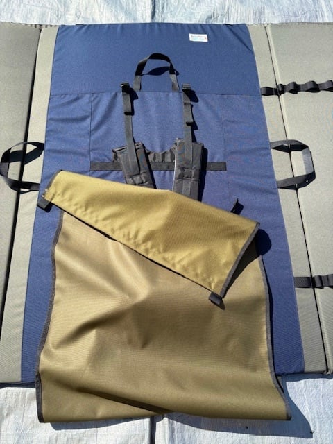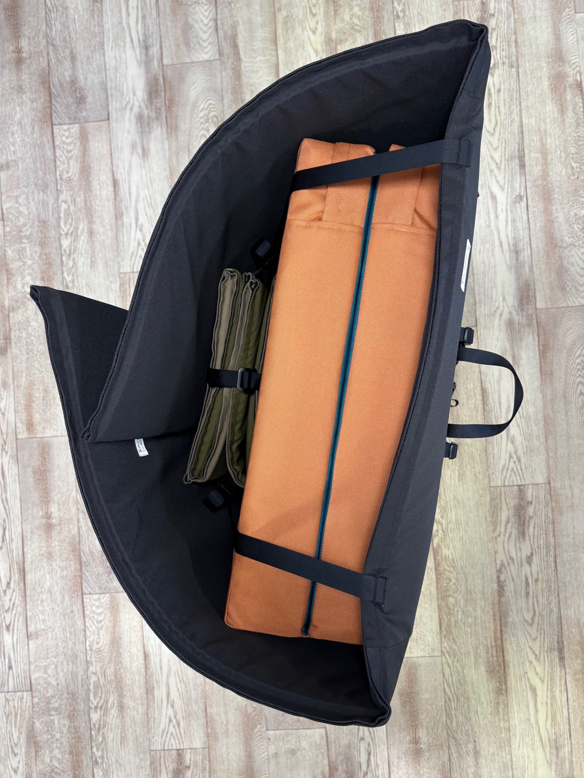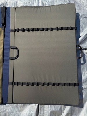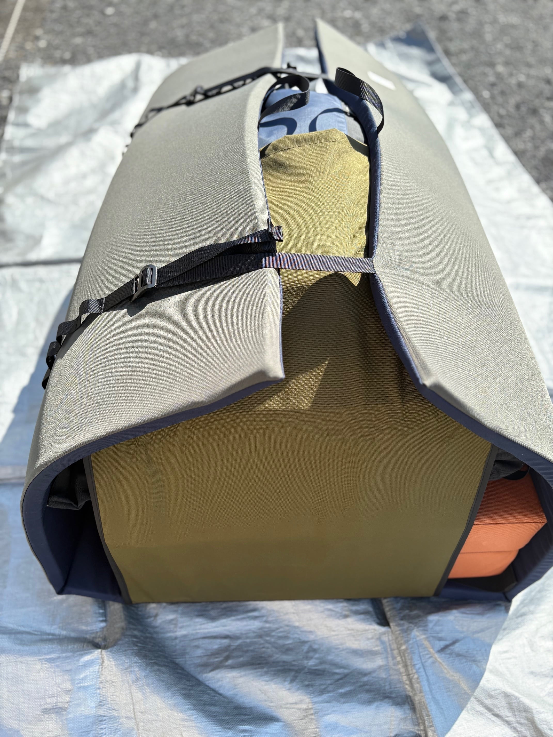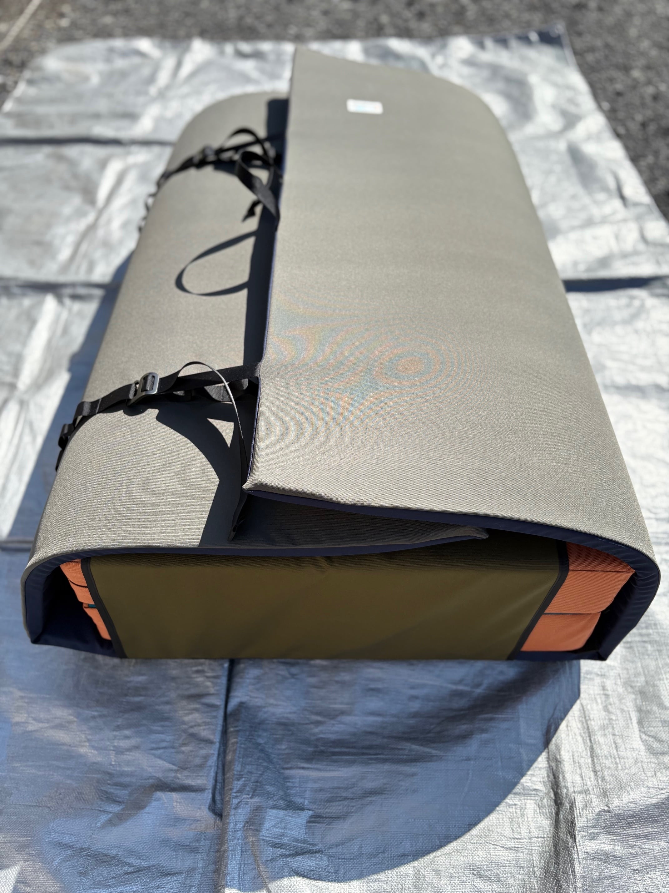 アウターラッピングスタイルのパッドキャリー kazahanaパッドマックスは最大2枚のメインパッド(※およそ 縦90cm×横60cm×厚さ20cm を2枚)をラッピングして背負い、そしてワイドカバーのパッドとして使用可能です。2cm厚ポリエチレンフォーム3面構造で、中央のフラップホルダー(画像 : 5)と2本のアウターコンプレッションベルトが収納品をしっかりとホールドします。このフラップホルダーは、パッドとして使用する際のショルダーハーネスカバーとしても機能します(画像 : 17、18)。そしてもちろん、背面部はkazahanaの完璧なバックパックショルダーハーネスを備えて(画像 : 16)メインパッドを内包しても軽快に歩行できます。