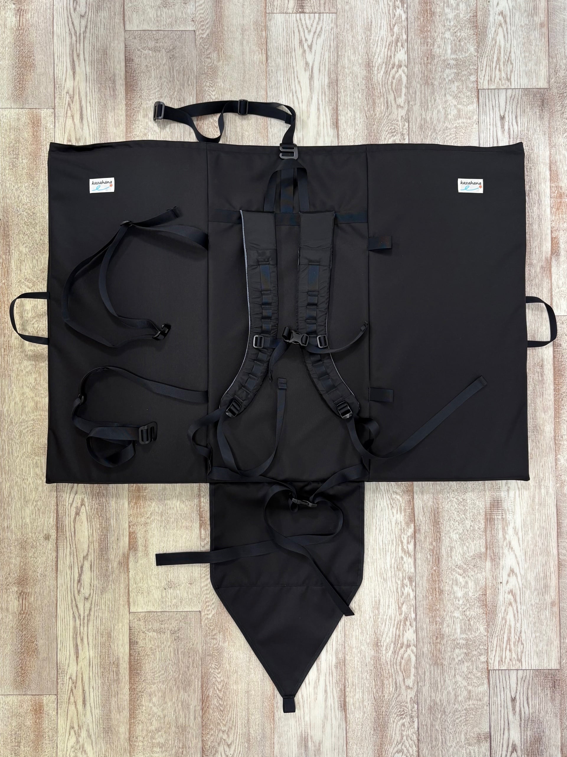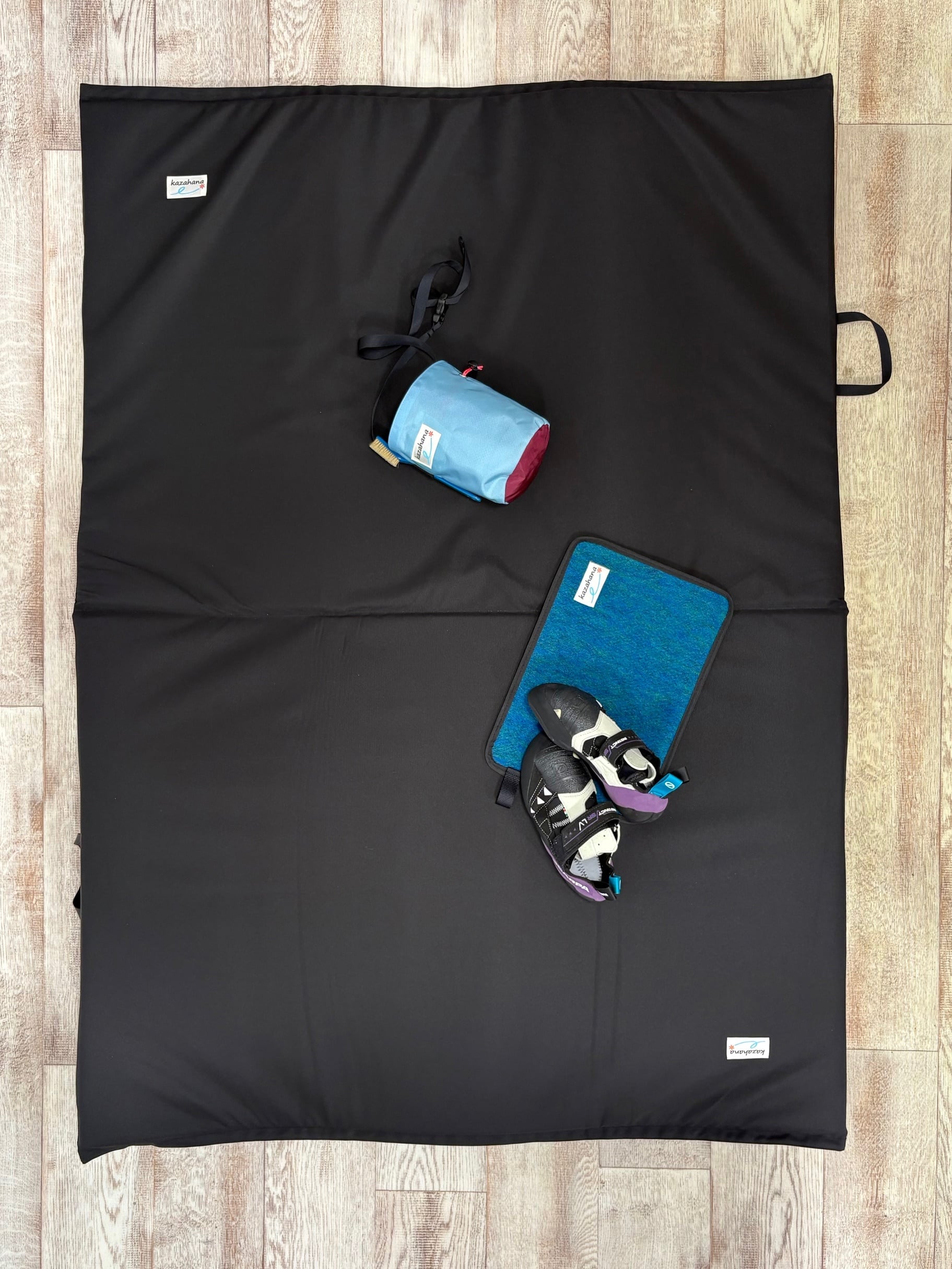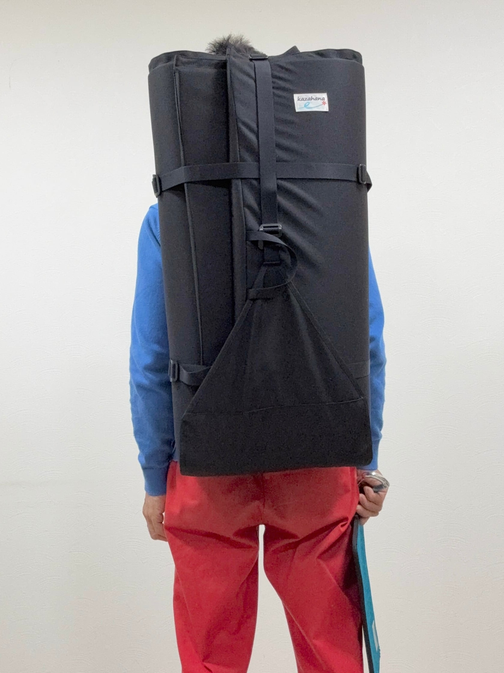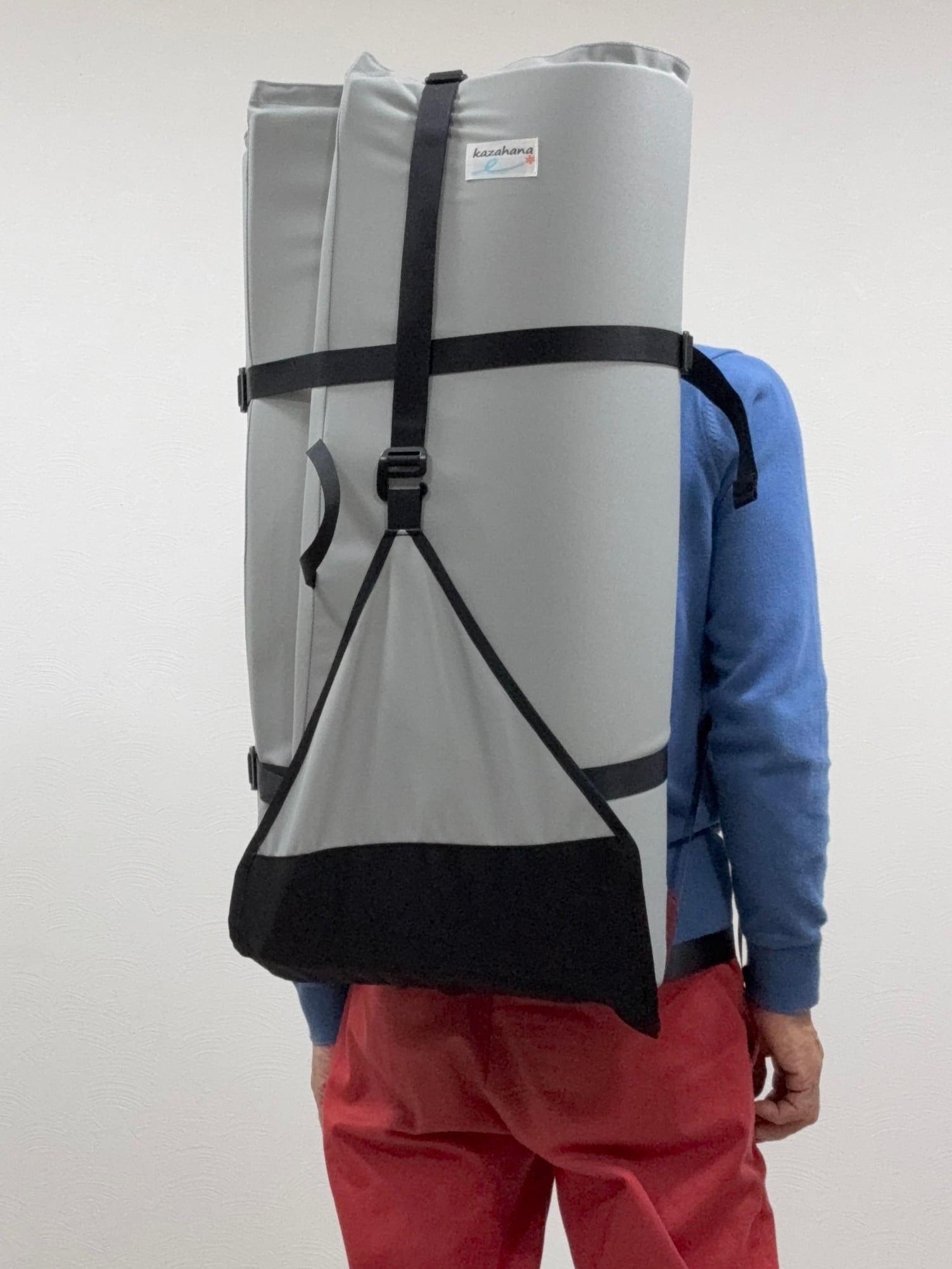 kazahanaのポピュラーなアジリティパッド、"マイパッド" がモデルチェンジです。1.7cm厚ポリエチレンフォーム2面構造となり大幅に軽量化しました。背面部のバックパックショルダーハーネスにチェストベルト、ウェストベルトを備えた快適なバックパックフィッティングは変わりません。2本のホリゾンタルコンプレッションはおよそ198cmの有効長があり、アジャスタースライダーを備えて余分なストラップの煩わしさを最小限に抑えています。底部のデルタフラップ + バーティカルストラップ(有効長およそ82cm)で収納品もしっかりとホールドします。ボルダリング時のデルタフラップはショルダハーネスカバー、ストラップ類をまとめるスロットとして機能します。これらストラップを利用して、ver.2マイパッドはファインダーパッドはもちろん、エリア51パッドも持ち運ぶことが可能です。(※パッド内に収納する用具類の大きさなどにもよります)