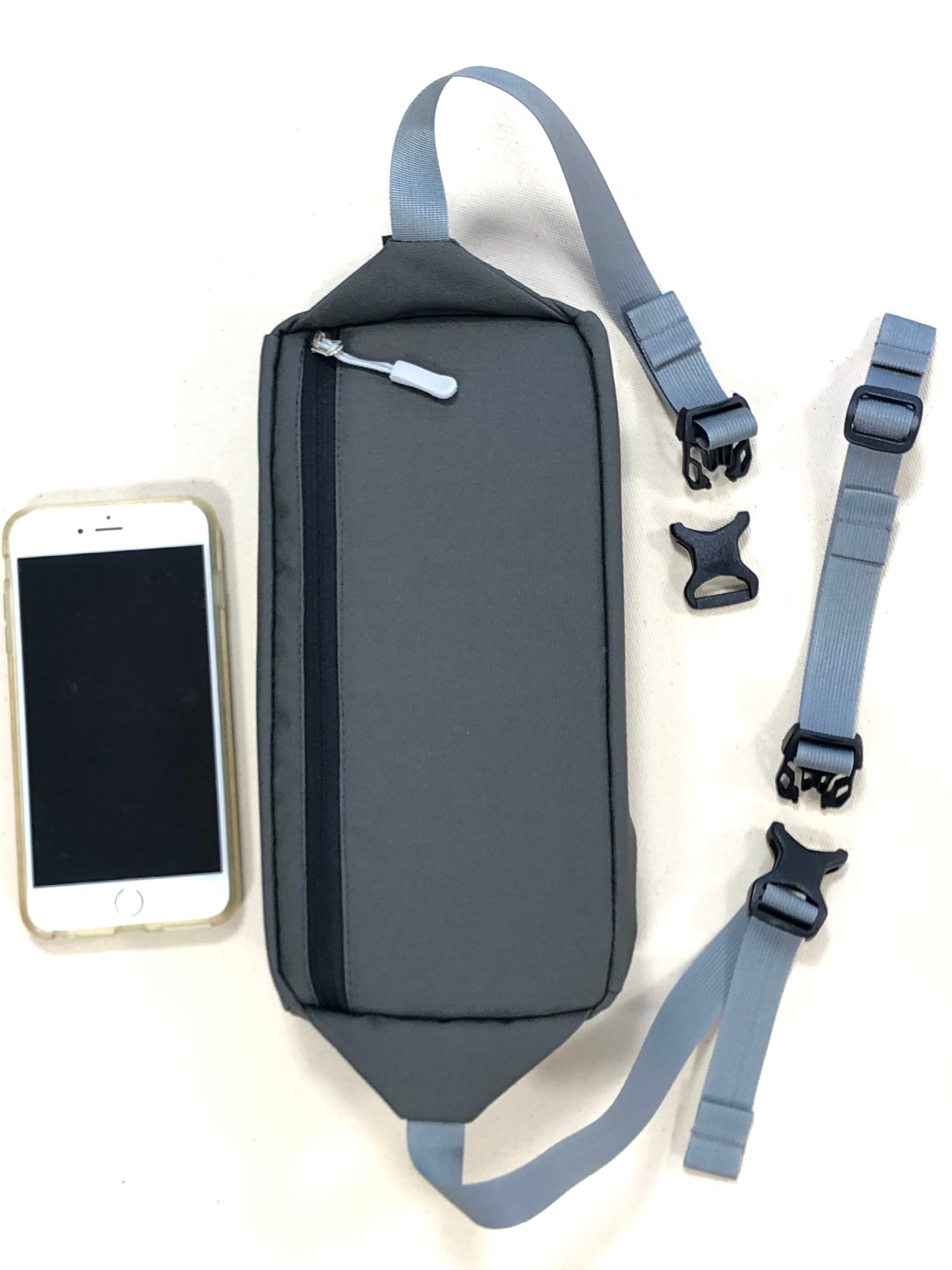 kazahanaバックパックのショルダーハーネスに取付け、ウォーターボトルやスマートフォンを収納、素早くアクセスできるフロントケース、それが “kazahanaファサード” です。500mlのペットボトルサイズ収納、またボディー側はスマートフォン収納です(スマーフォン収納の前後はフォーム内蔵)。テープアジャスターが上下にあり、操作しやすい箇所へのポジション移動も容易です。 また、パックから取り外しても単体のポーチとして使用できます。